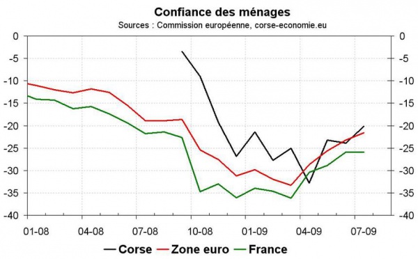 Au mois de juillet 2009, l’indicateur de confiance des ménages corse-economie.eu est en hausse de 3,8 points, pour atteindre -20,1 points. L’indice est au plus haut depuis novembre de l’année dernière. Dans la zone euro et en France, l’indice a aussi progressé, respectivement à -21,6 points et -25,9 points respectivement. Le...