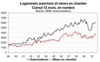 * Toutes les données sont ici présentées en cumul 12 mois. Ainsi, les résultats de juillet 2010 pour les permis correspondent à la somme sur les 12 mois précédent (juillet inclut). Ceci permet de lisser (un peu) la volatilité et la saisonnalité.